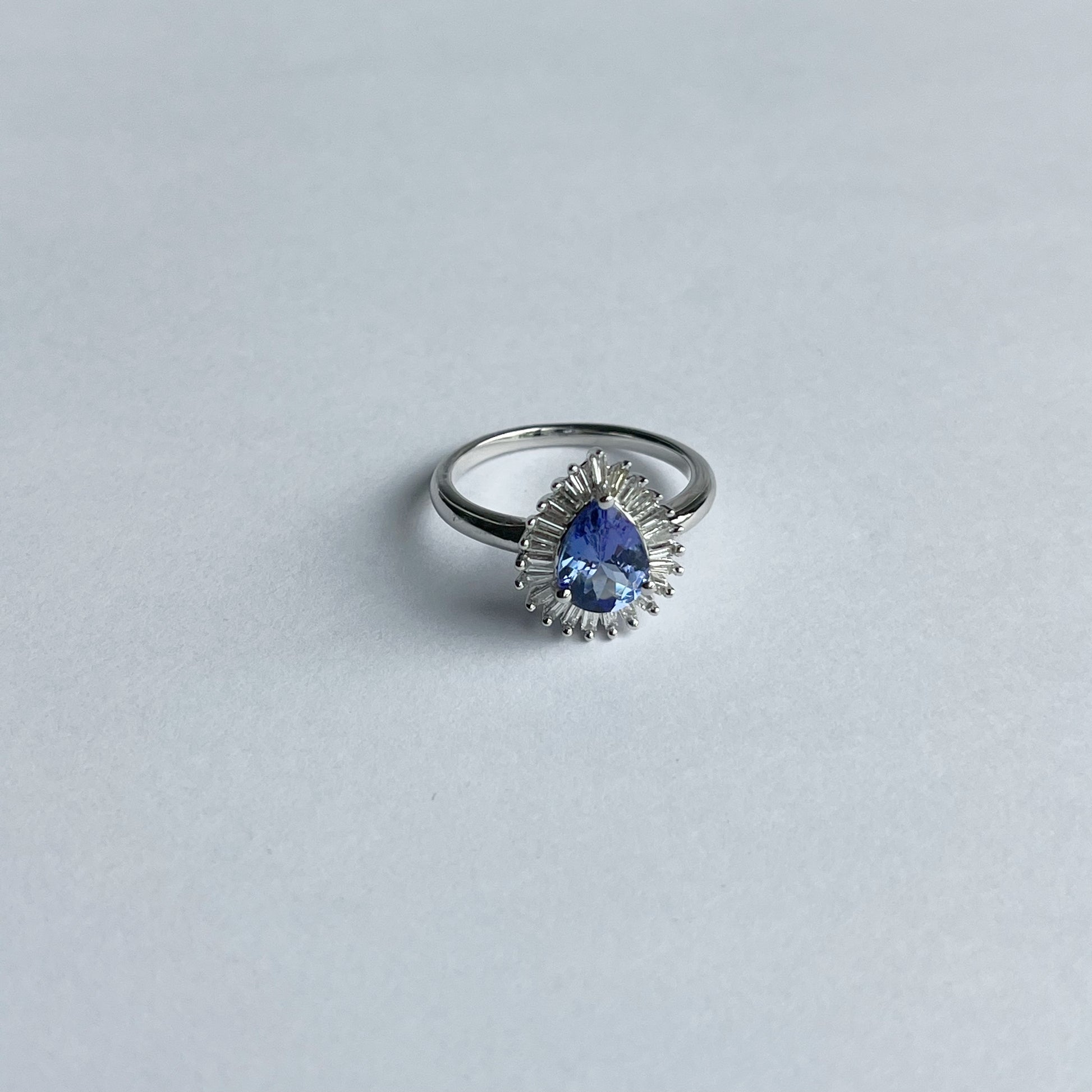 Anillo de oro blanco 10K con tanzanita corte pera y halo de diamantes baguette 0.20ct
