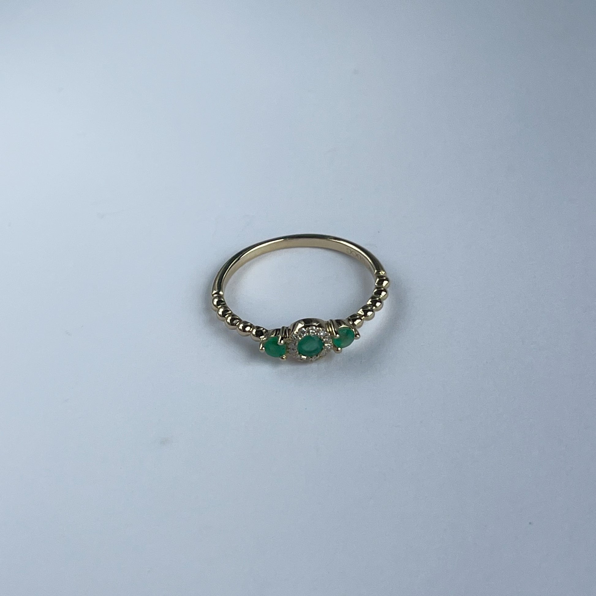 Anillo en oro amarillo 14k con tres esmeraldas redondas 0.25ctw y diamantes 0.04ct con aro de bolitas
