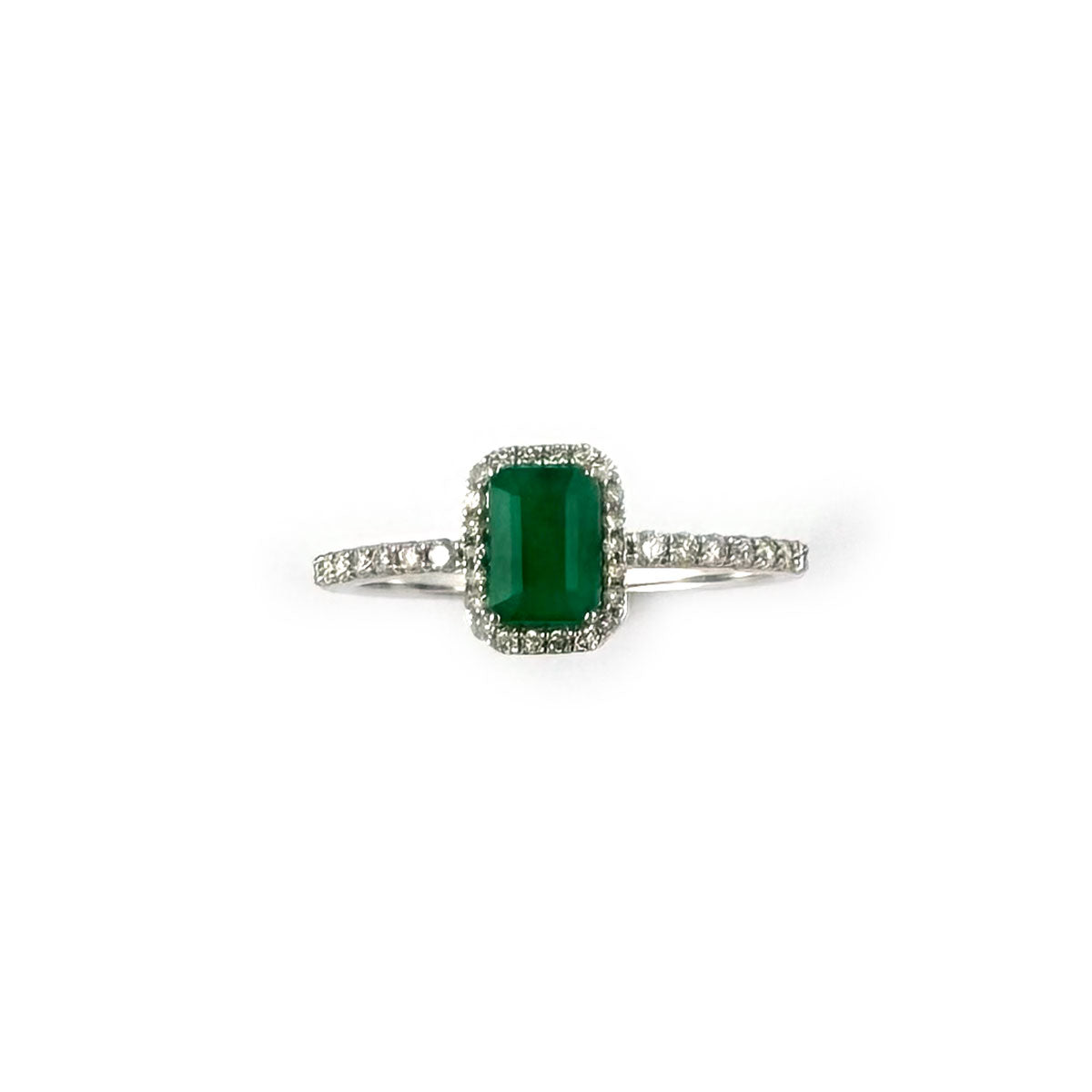Anillo en oro blanco 10K con esmeralda corte esmeralda y halo de diamantes 0.25ctw