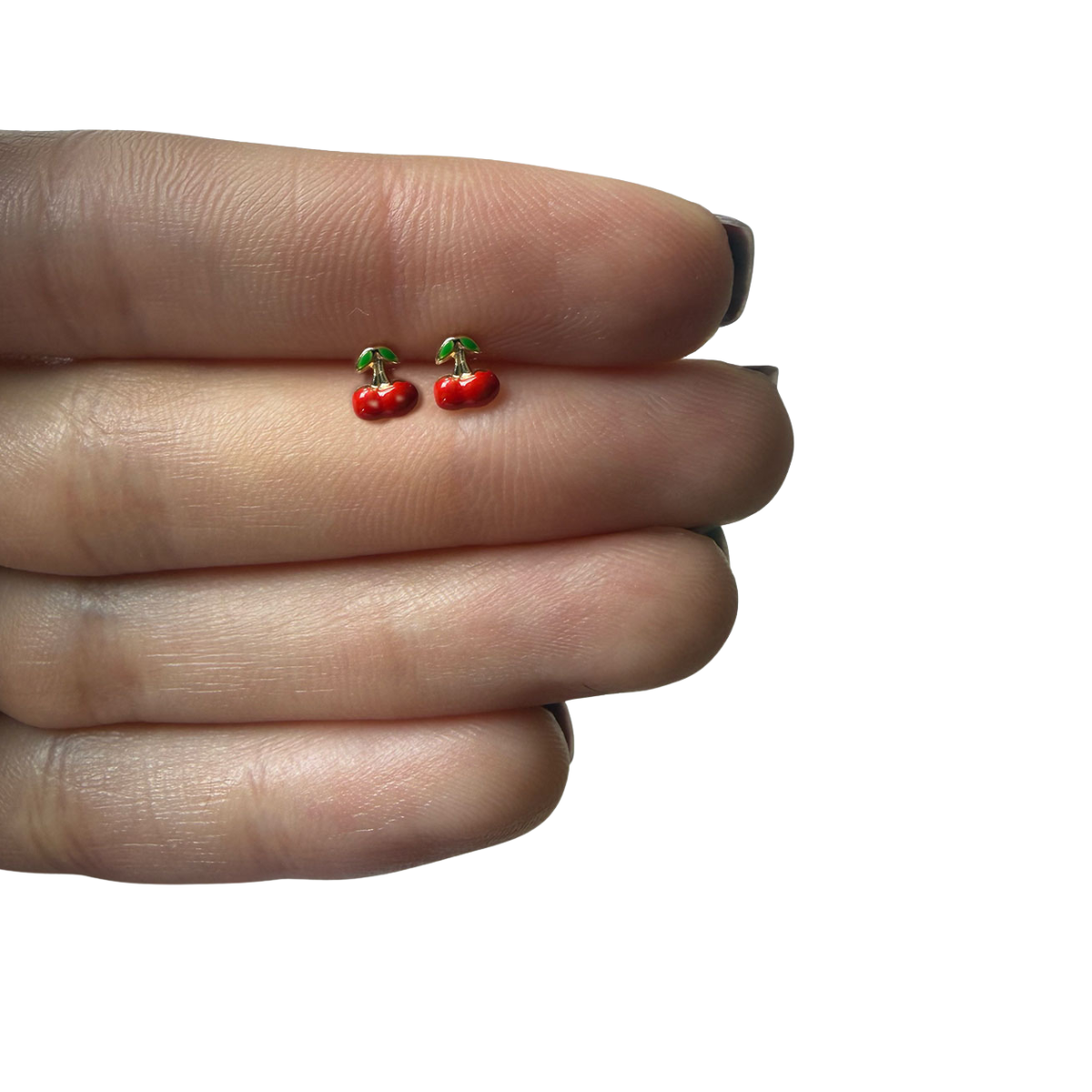 Aretes cereza esmaltada en oro amarillo 14K con tope rosca