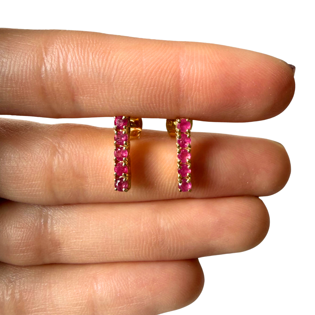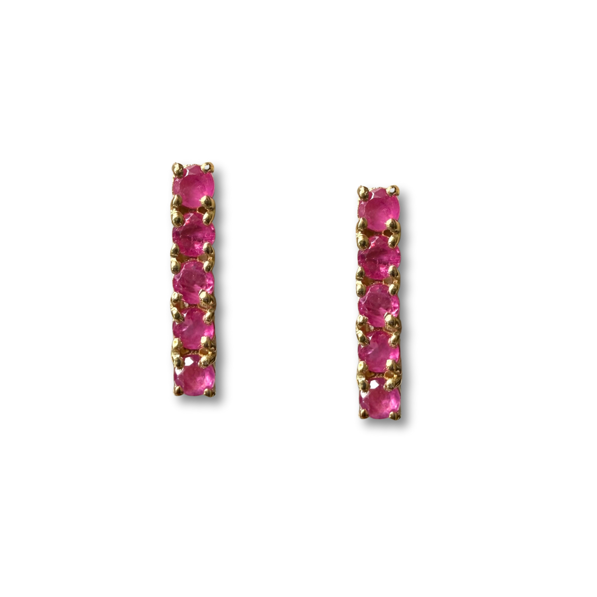Aretes de plata con baño de oro y rubíes redondos en fila