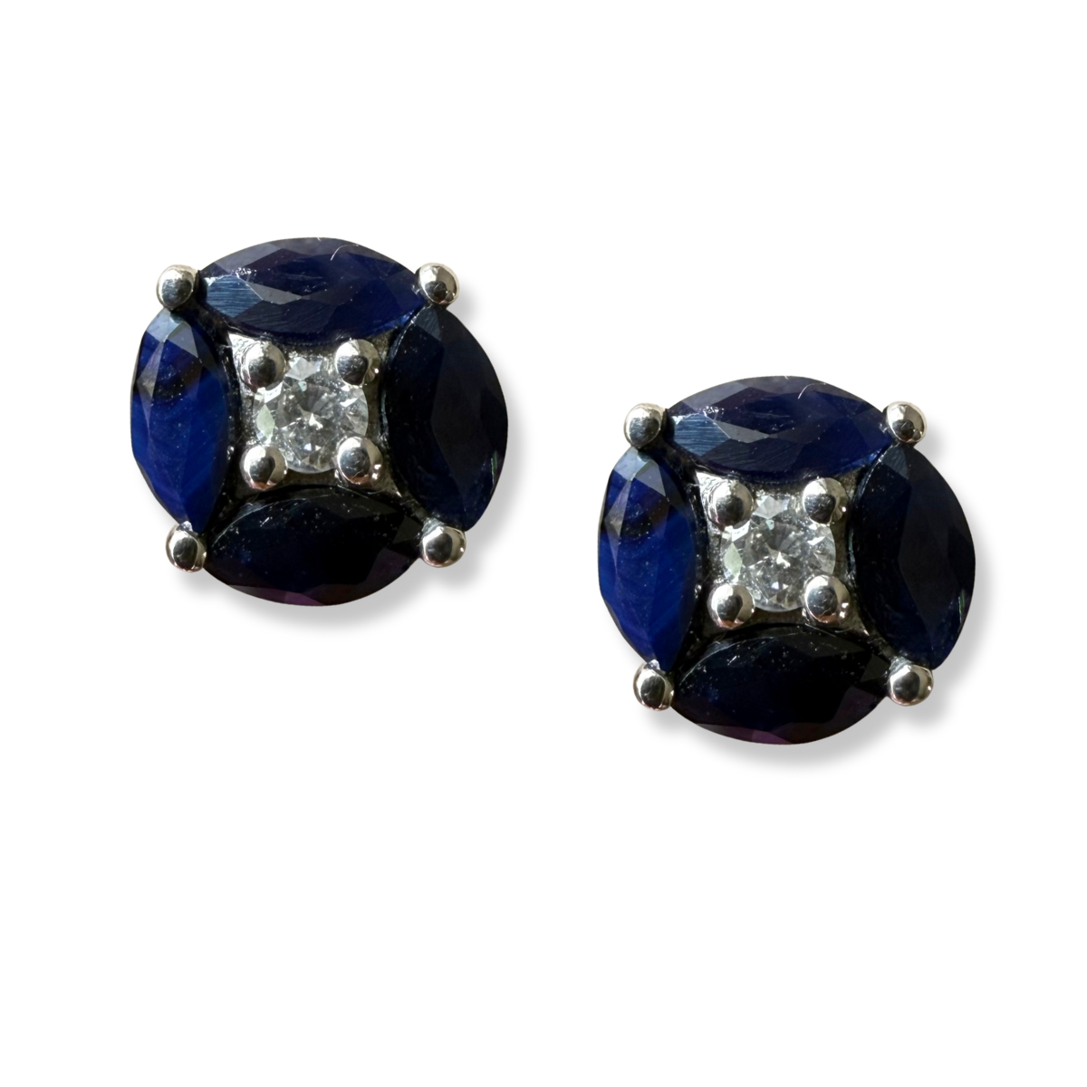 Aretes de plata redondos con marquesas de zafiro y diamante central 0.08ctw