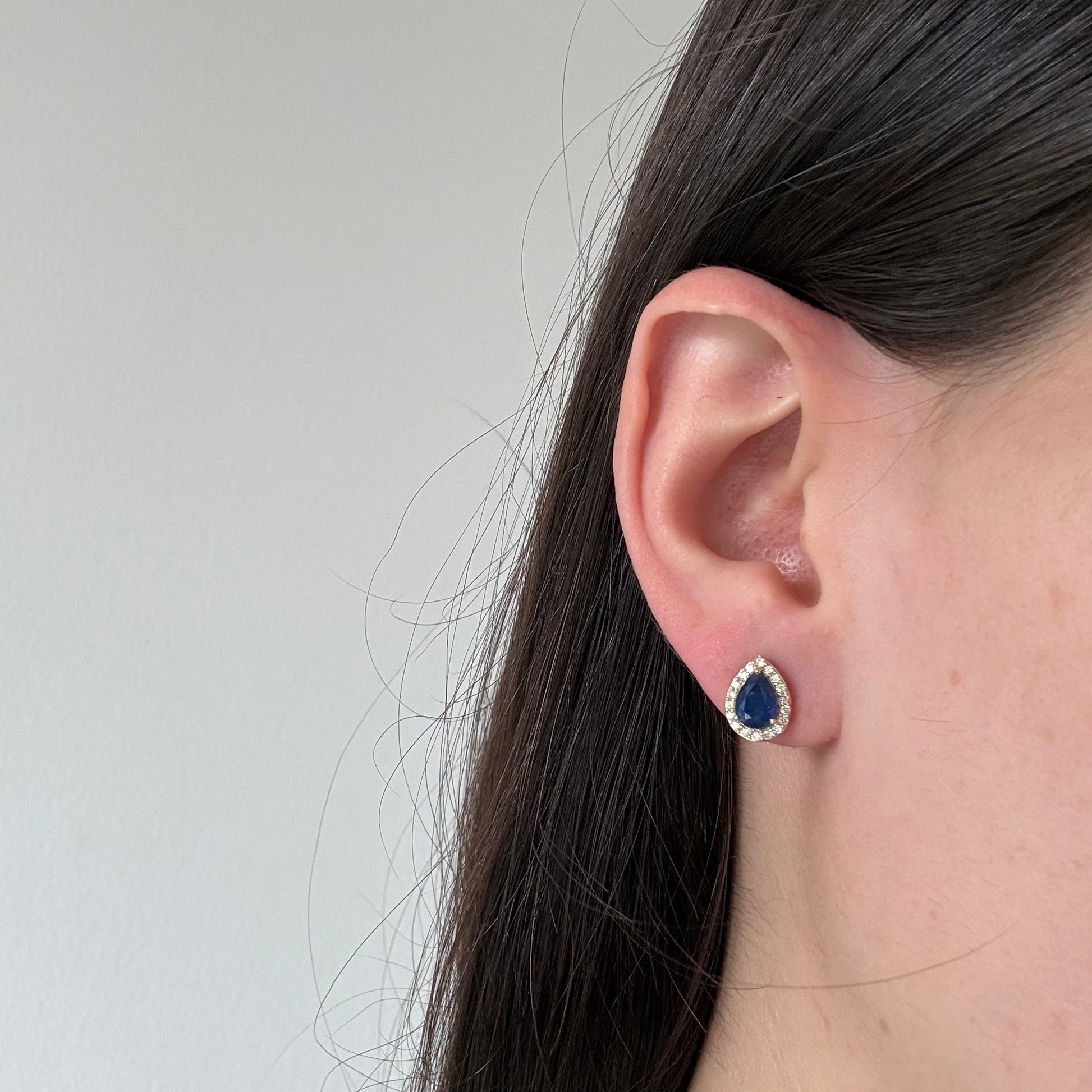 Aretes en oro amarillo 10K con zafiro corte pera y halo de diamantes 0.30ctw con broche rosca