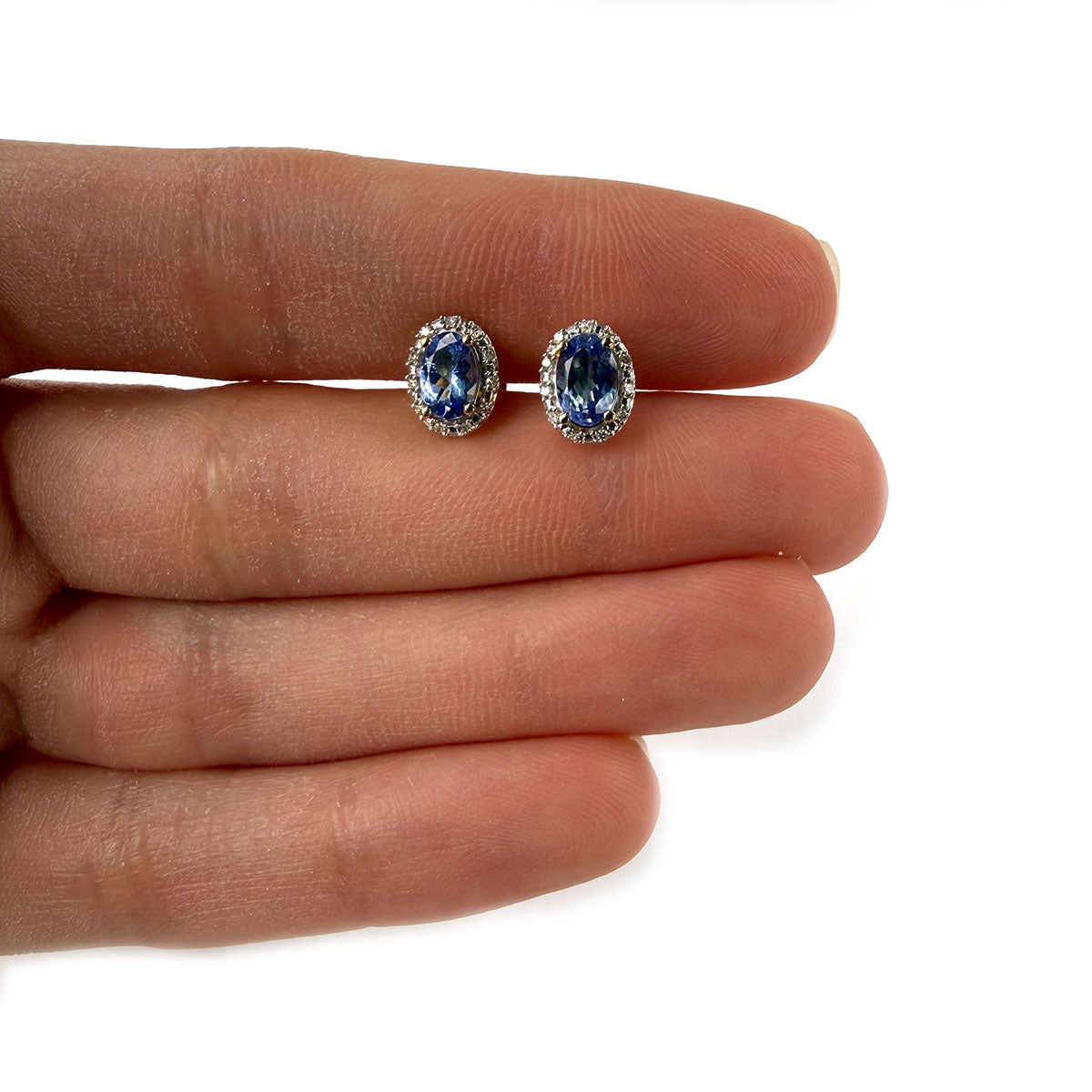 Aretes en oro amarillo 10k con zafiros ovalados y halo de diamantes 0.15ctw