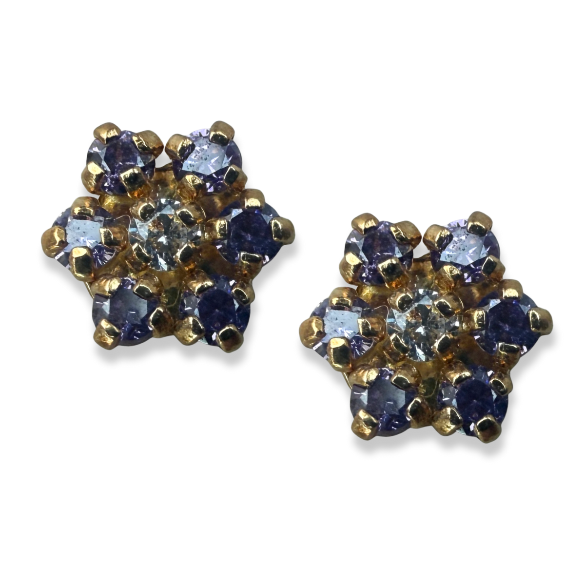 Aretes en oro amarillo 14k con flor de circonitas lila de 6 petalos