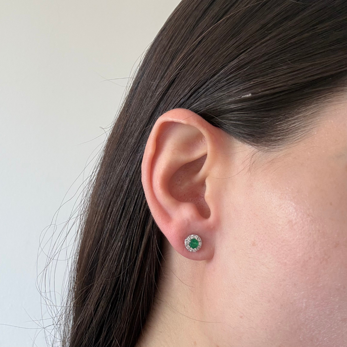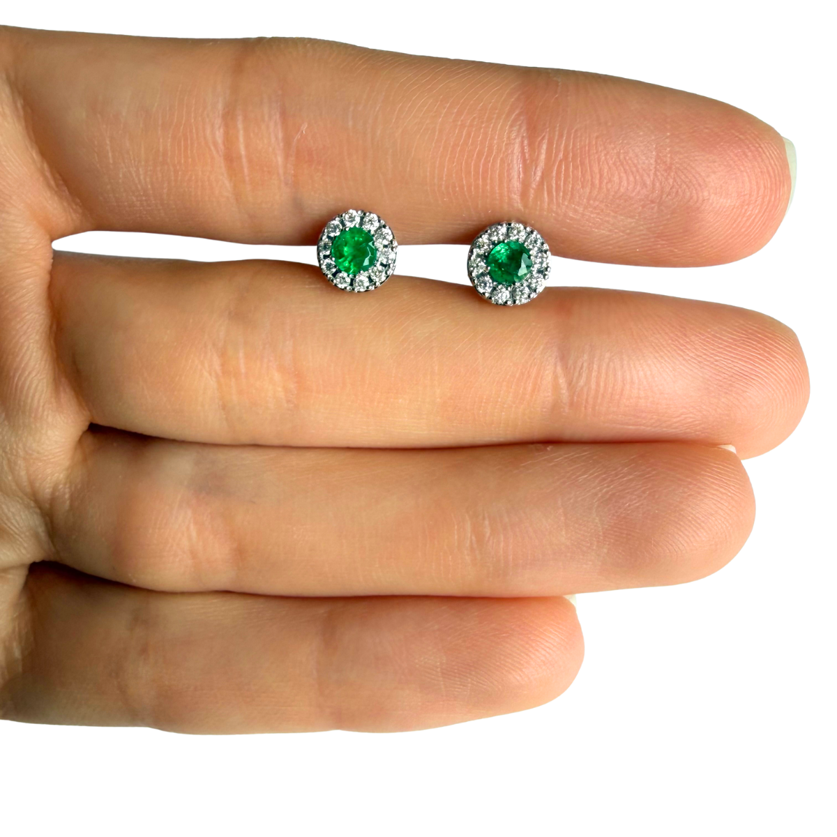 Aretes en oro blanco 14K con esmeralda redonda y halo de diamantes 0.20ctw