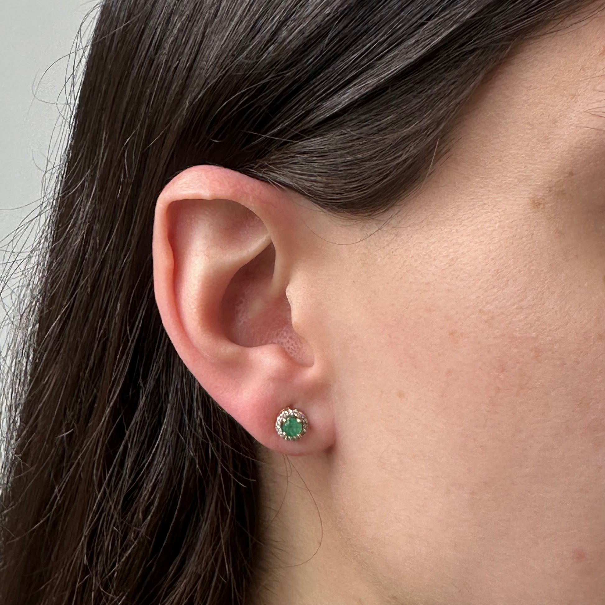 Aretes redondos en oro amarillo 10k con esmeraldas y halo de diamantes 0.10ctw
