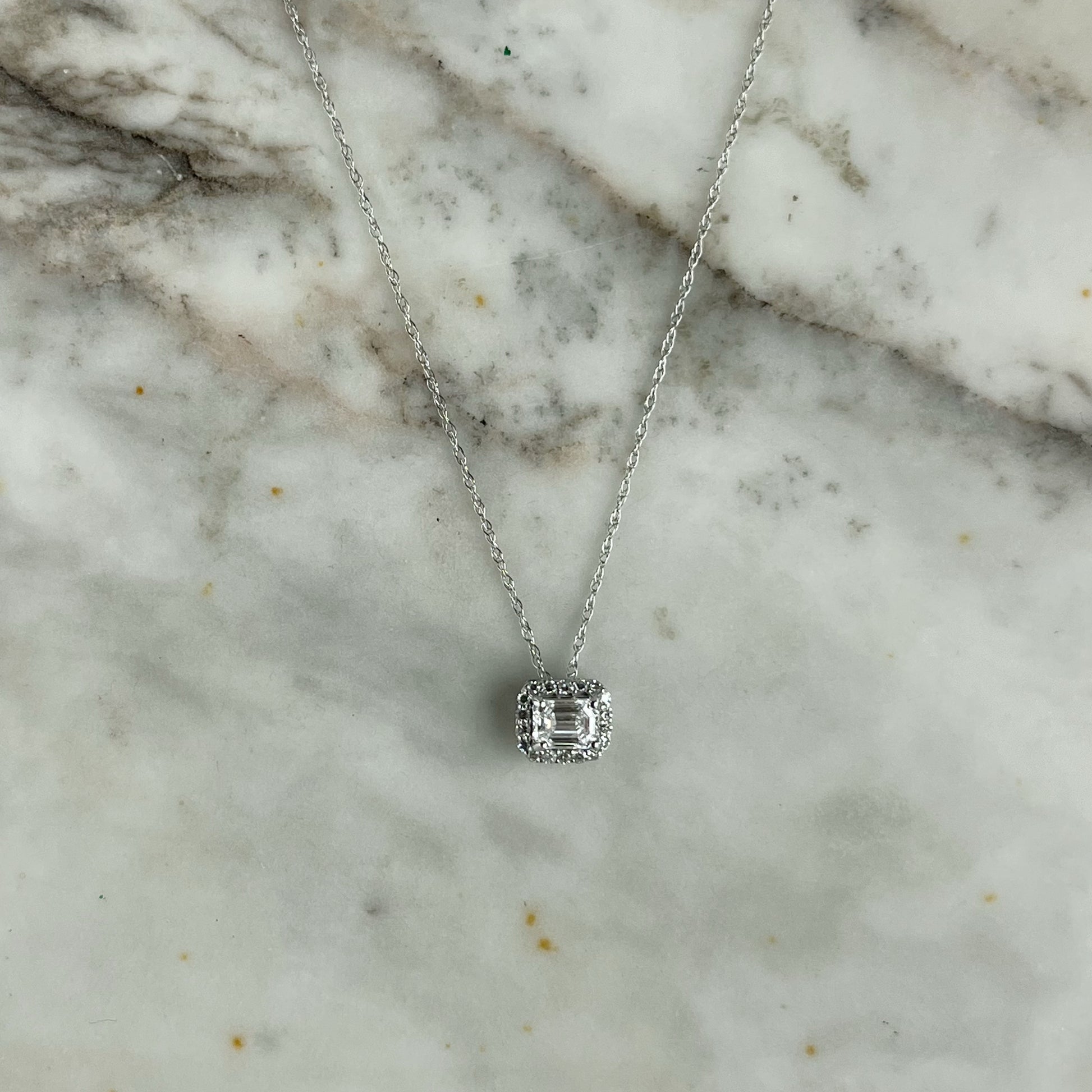 Collar de oro blanco 14k con dije de diamante de laboratorio corte esmeralda y halo de diamantes 0.50ctw