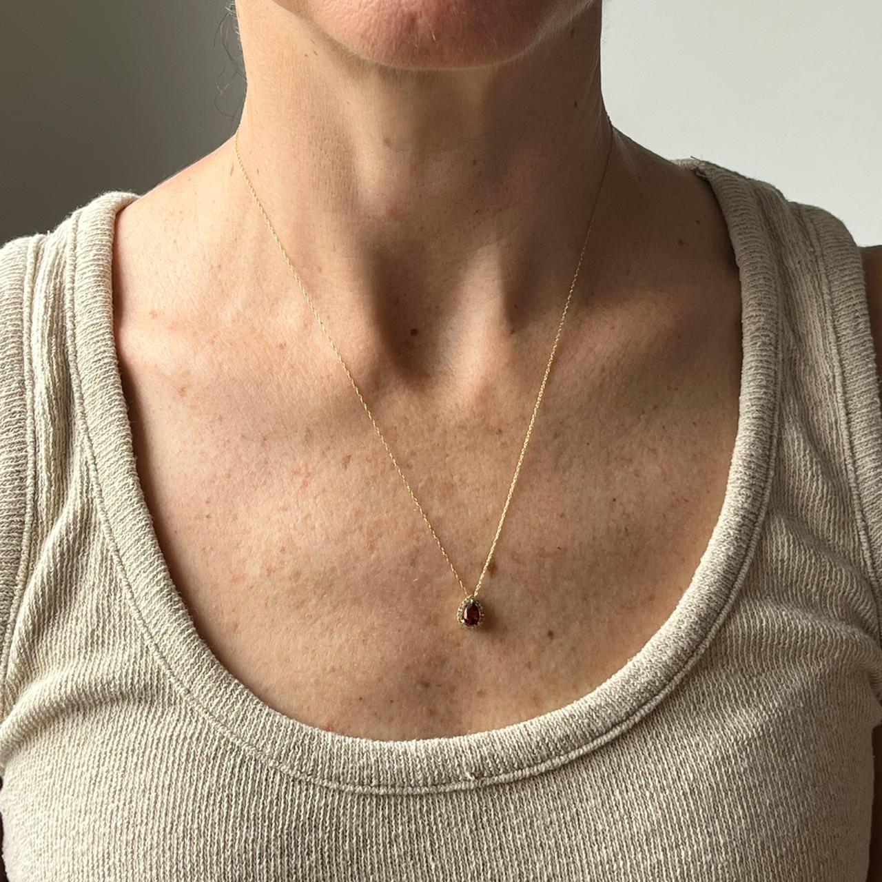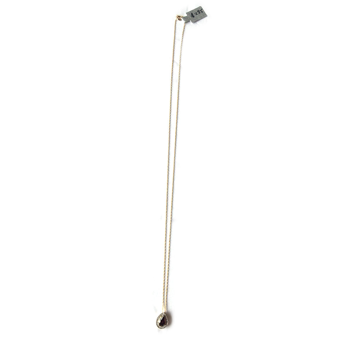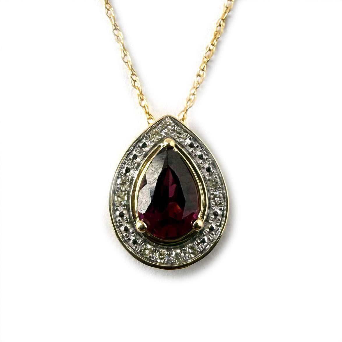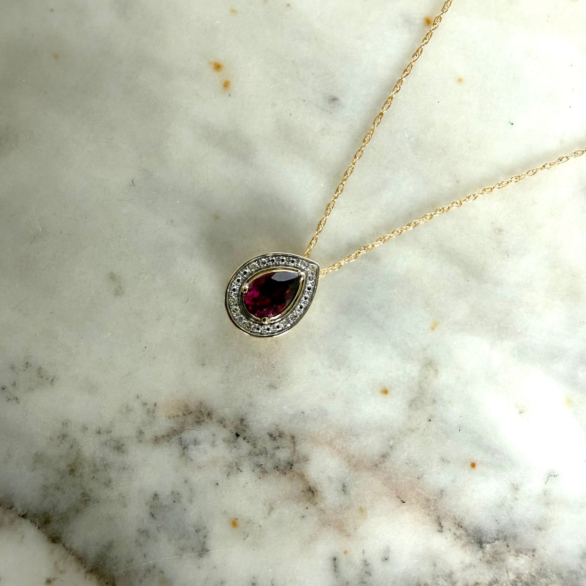 Collar en oro amarillo 10K con gota de granate rodolita y halo de diamantes 0.05ctw