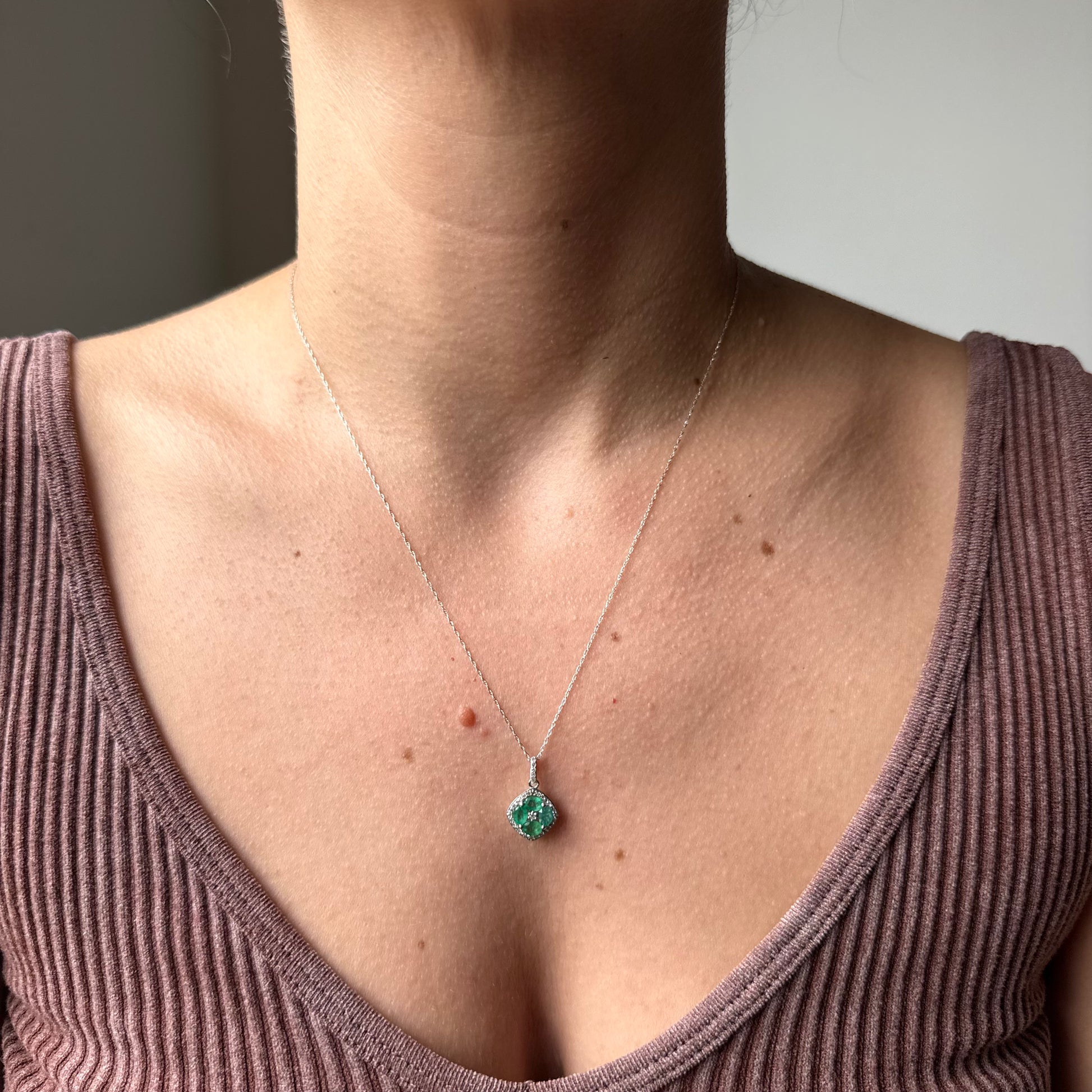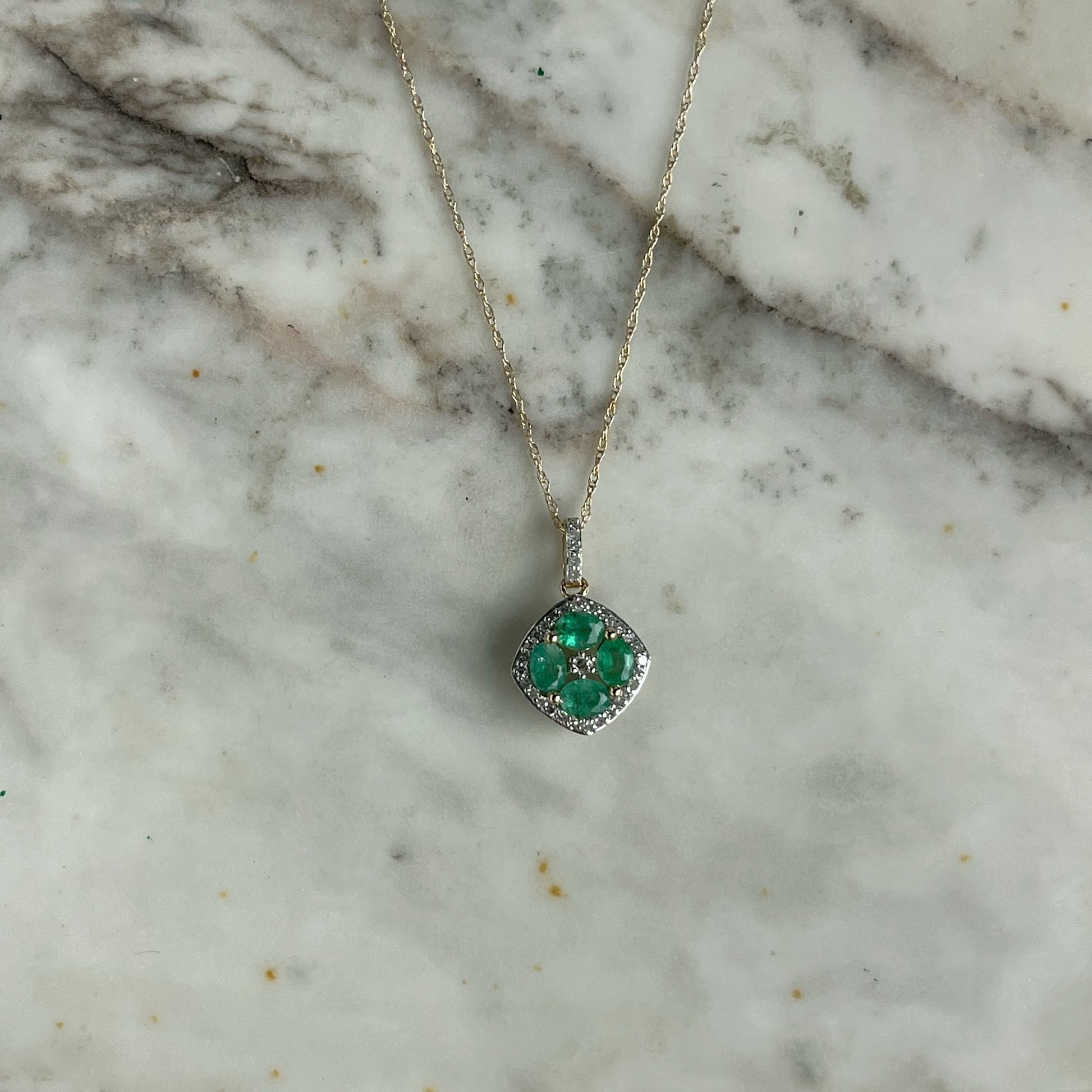 Collar en oro amarillo 14k con dije de esmeraldas en forma de flor y borde de diamantes 0.15ctw
