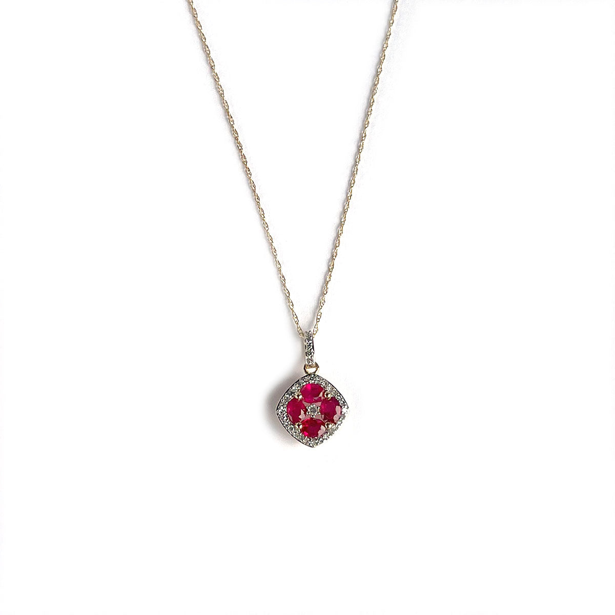 Collar en oro amarillo 14k con dije de rubíes en forma de flor y borde de diamantes 0.15ctw