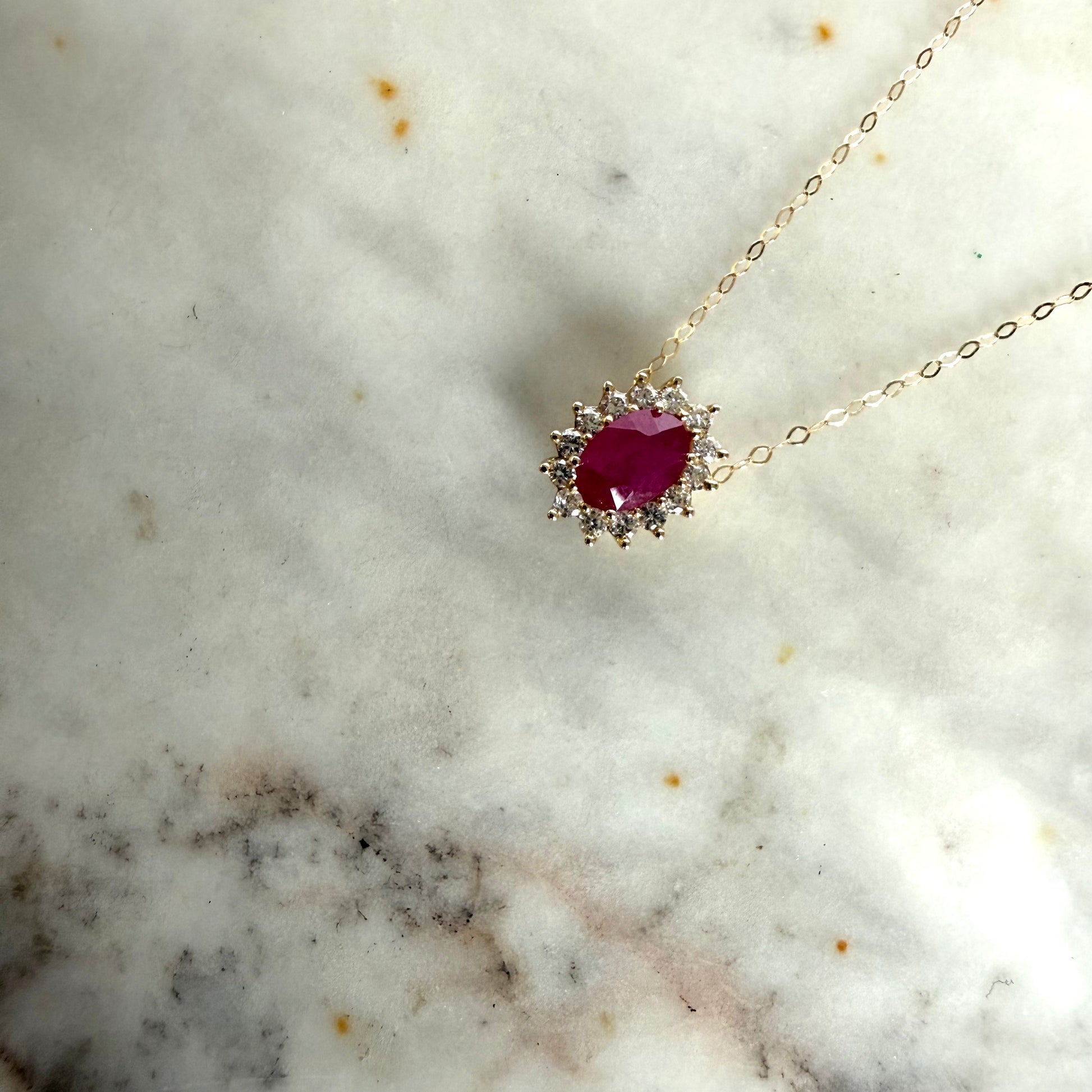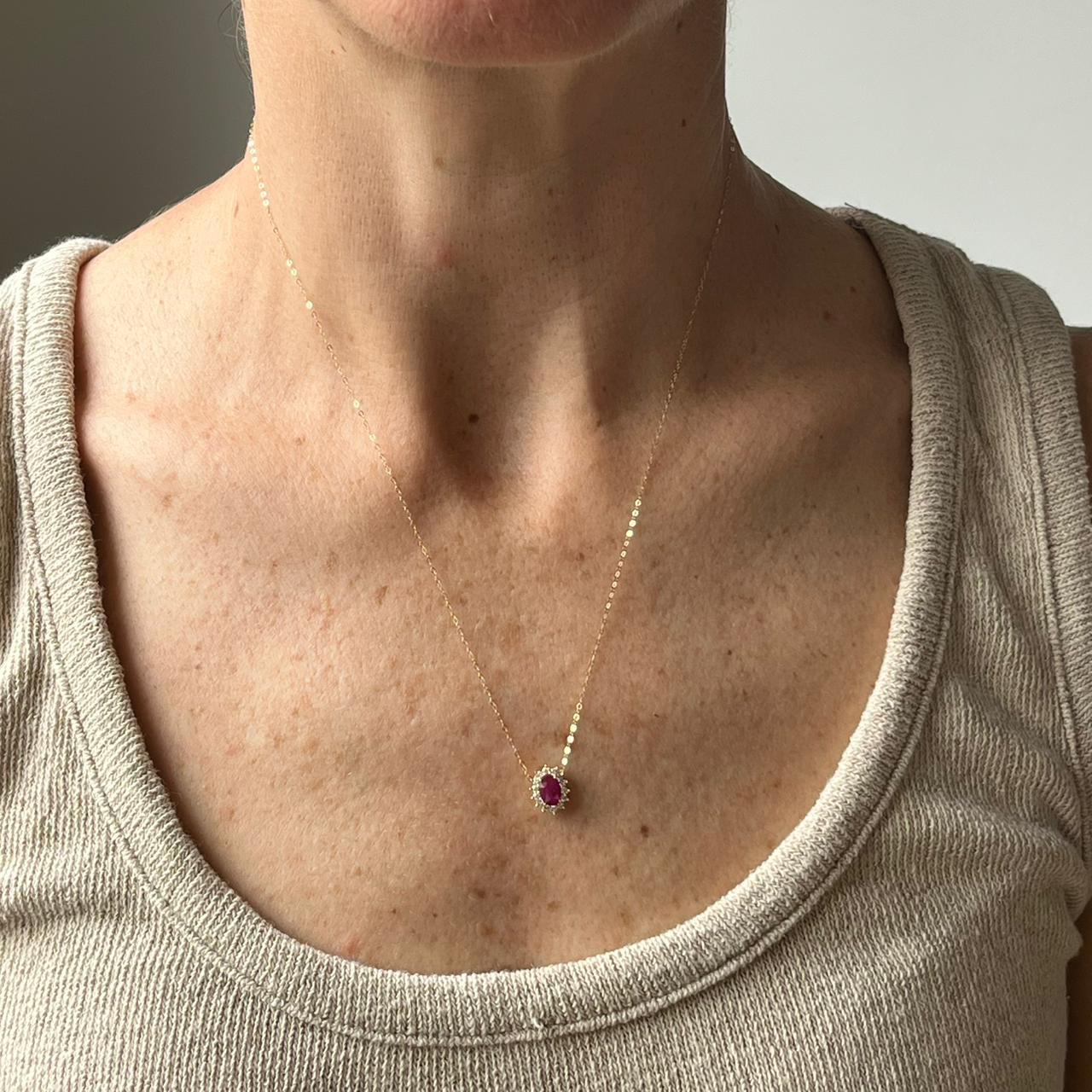 Collar en oro amarillo 14K con rubí ovalado y halo de diamantes 0.20ctw