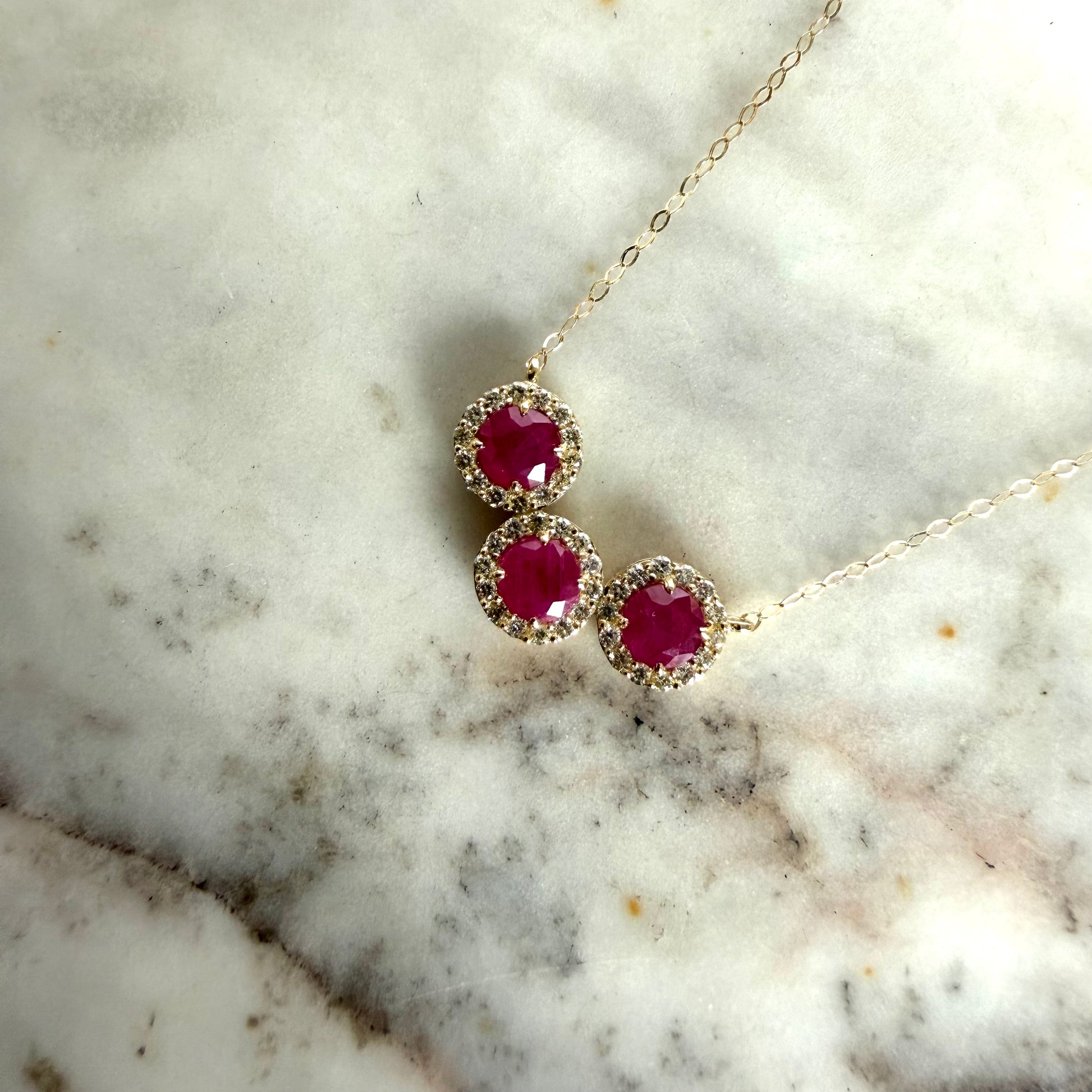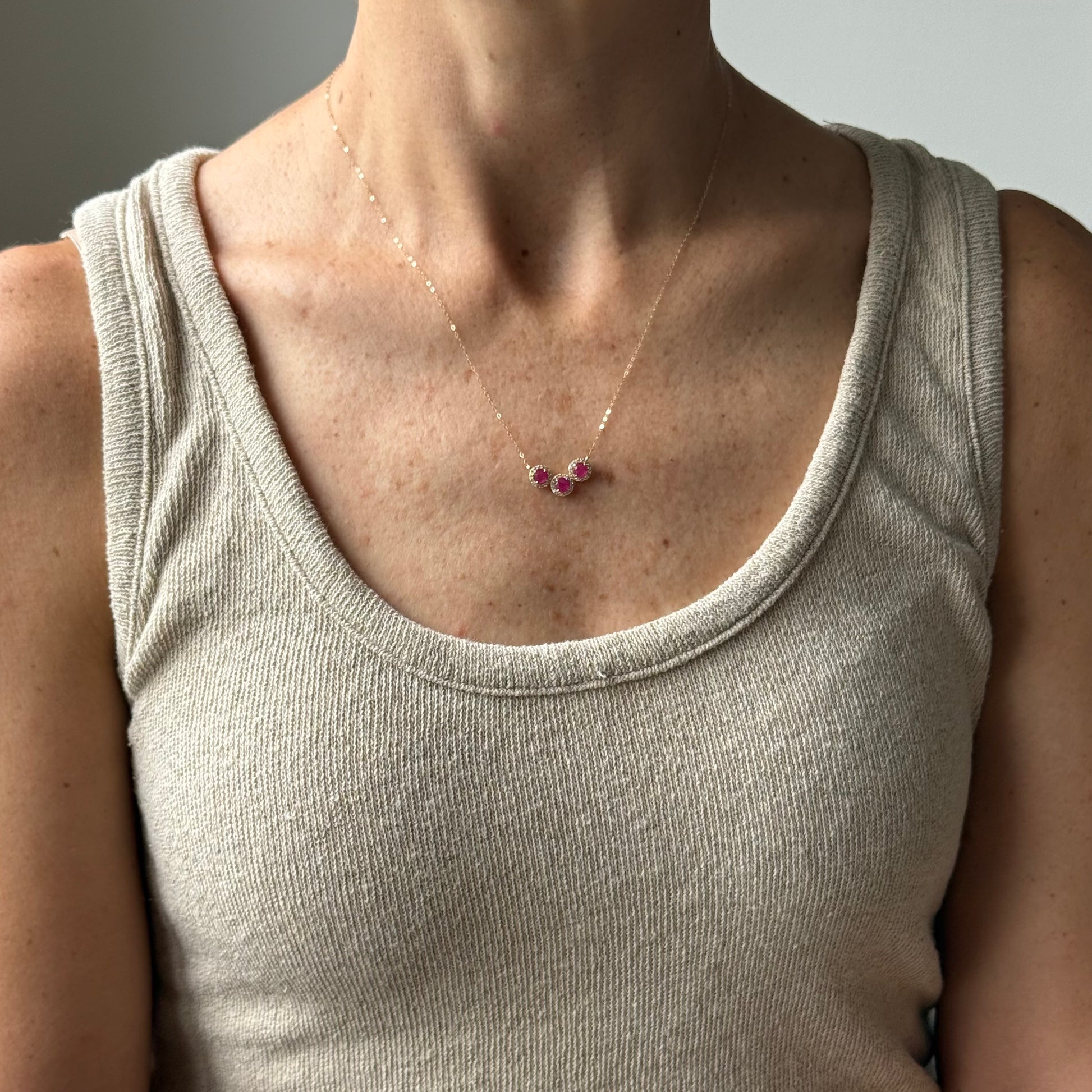 Collar en oro amarillo 14K con rubíes redondos y halo de diamantes 0.25ctw