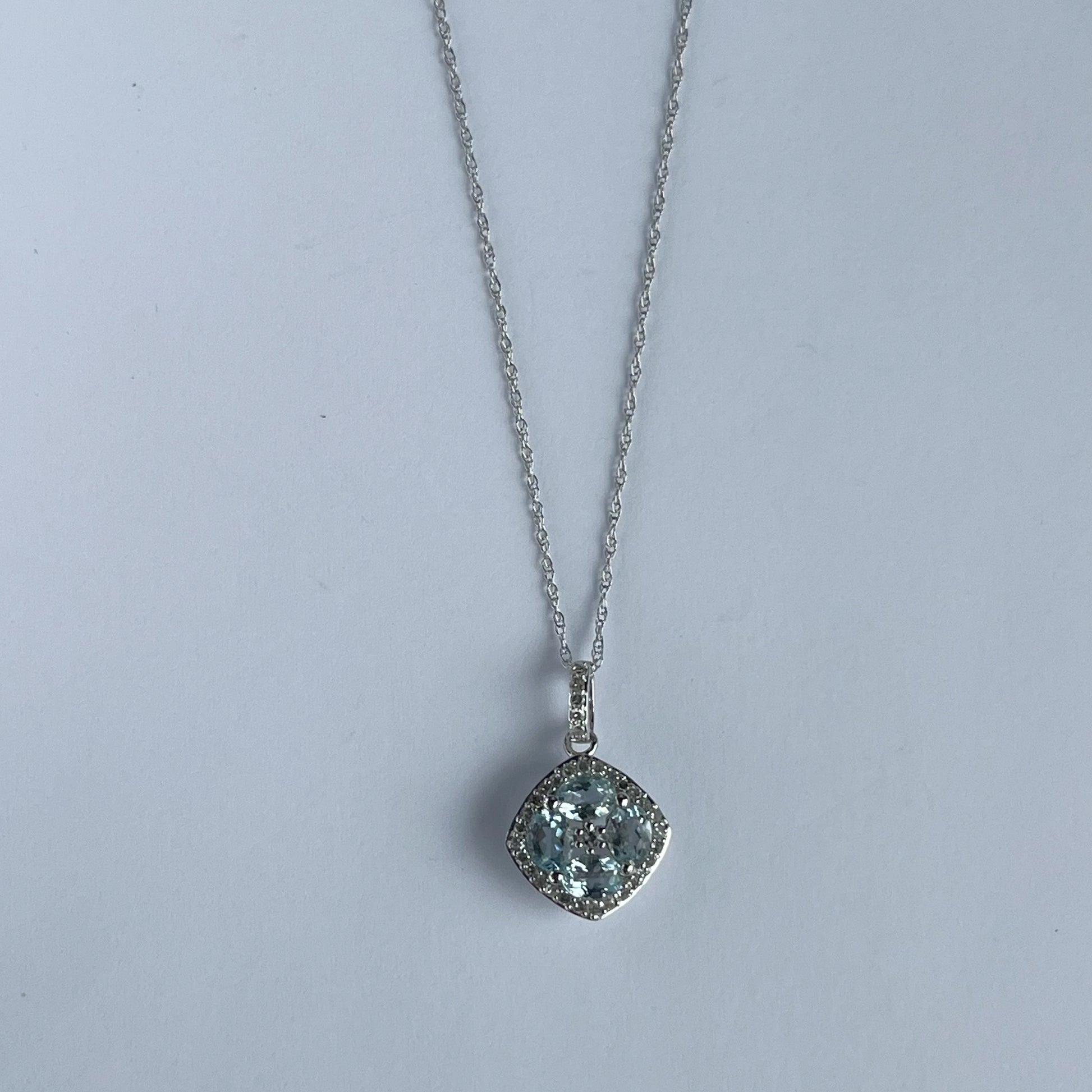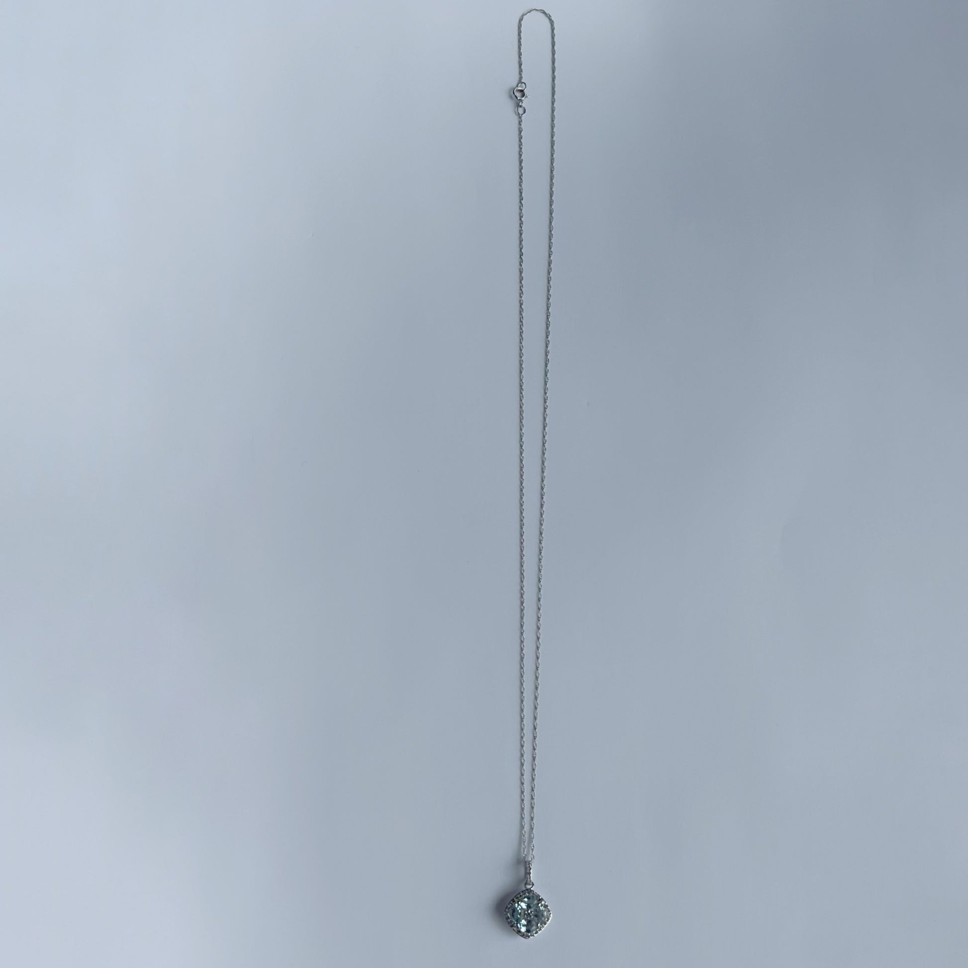 Collar en oro blanco 14k con dije de aquamarinas en forma de flor y borde de diamantes 0.15ctw