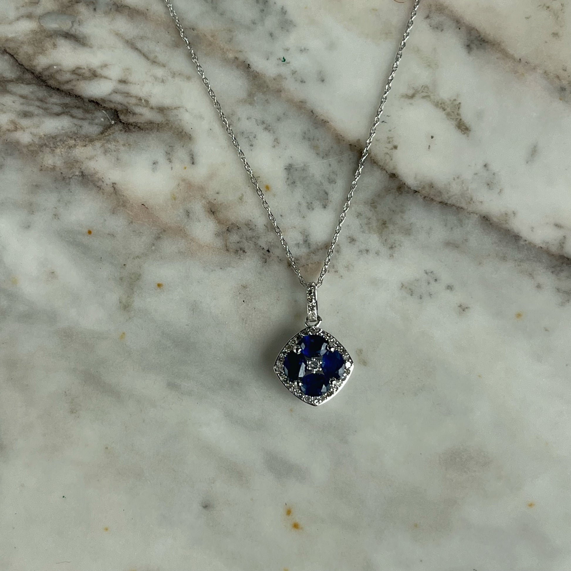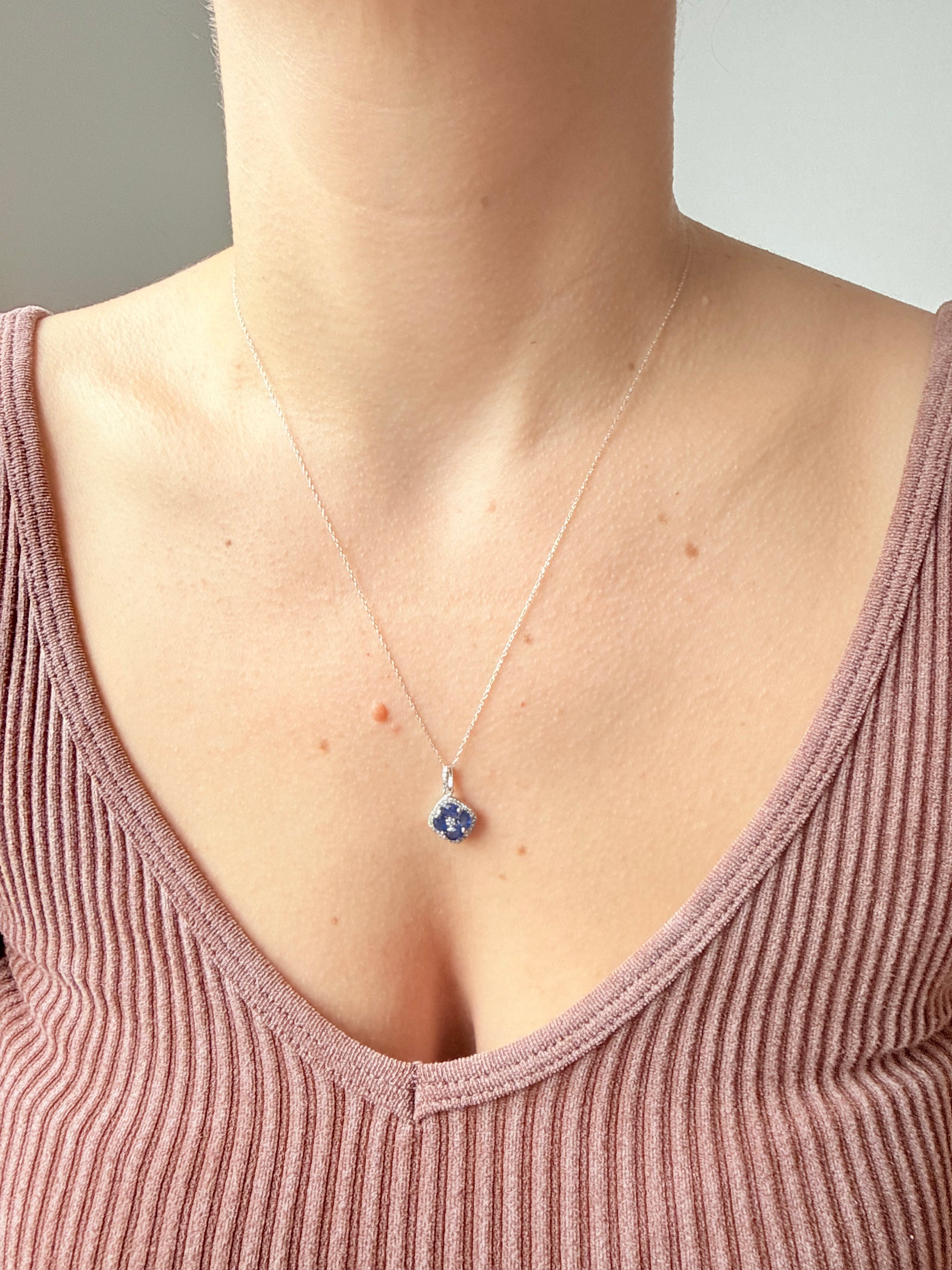 Collar en oro blanco 14k con dije de zafiros en forma de flor y borde de diamantes 0.15ctw