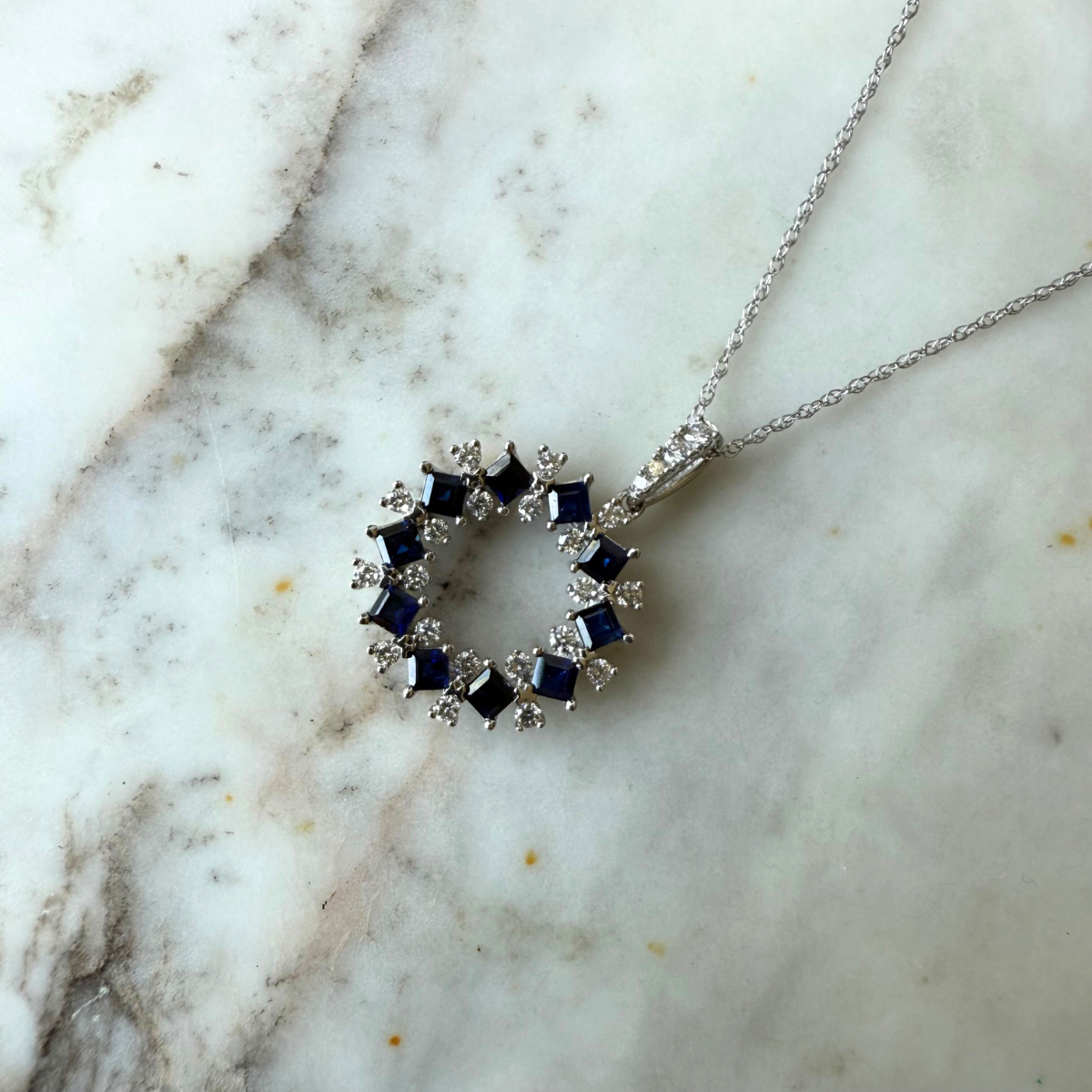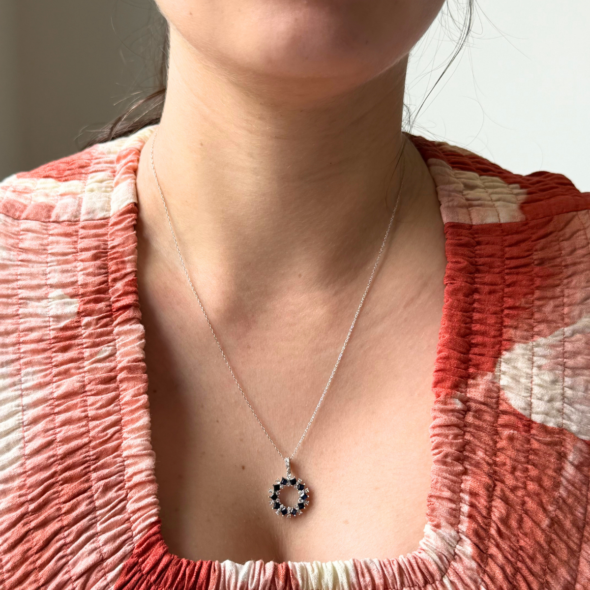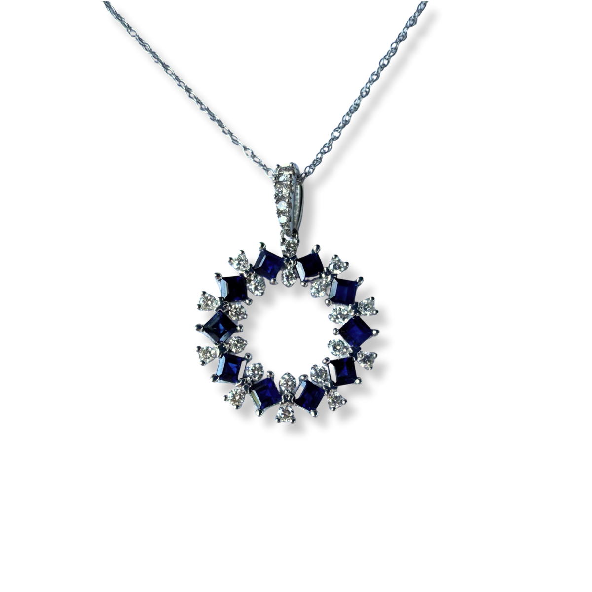 Collar en oro blanco 14K con dije redondo de zafiros y diamantes 0.33ctw