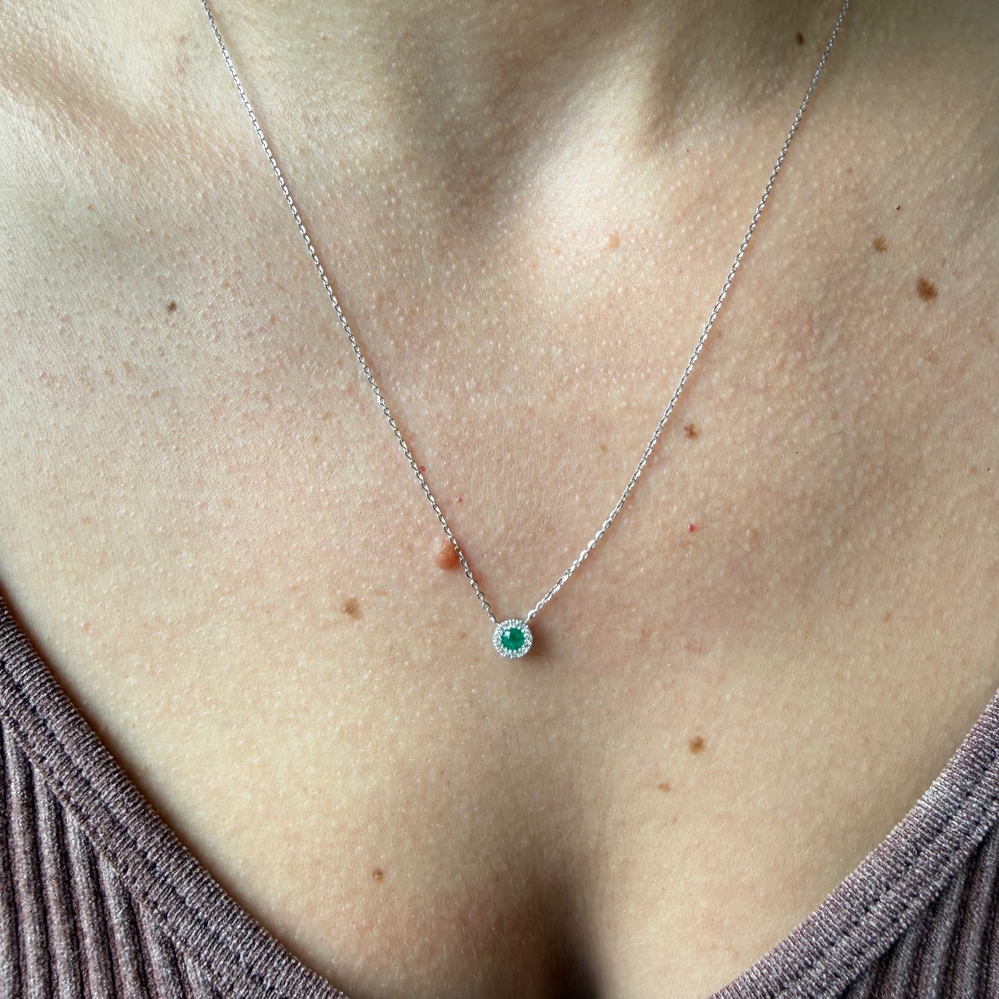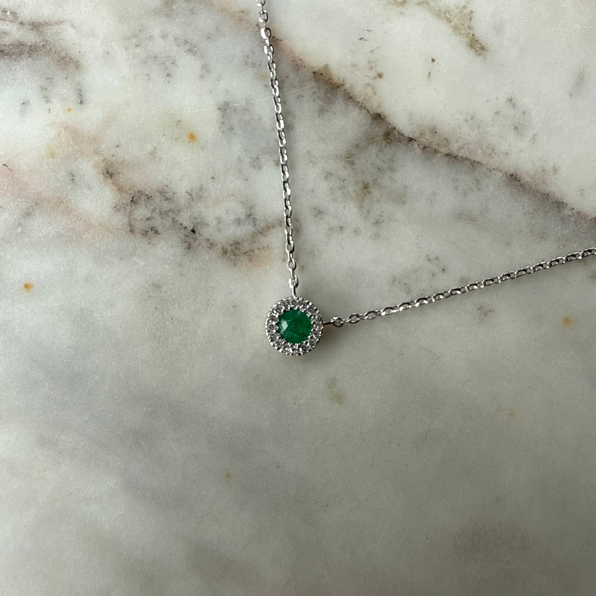 Collar en oro blanco 14k con esmeralda redonda 0.12ct y halo de diamantes 0.04ctw