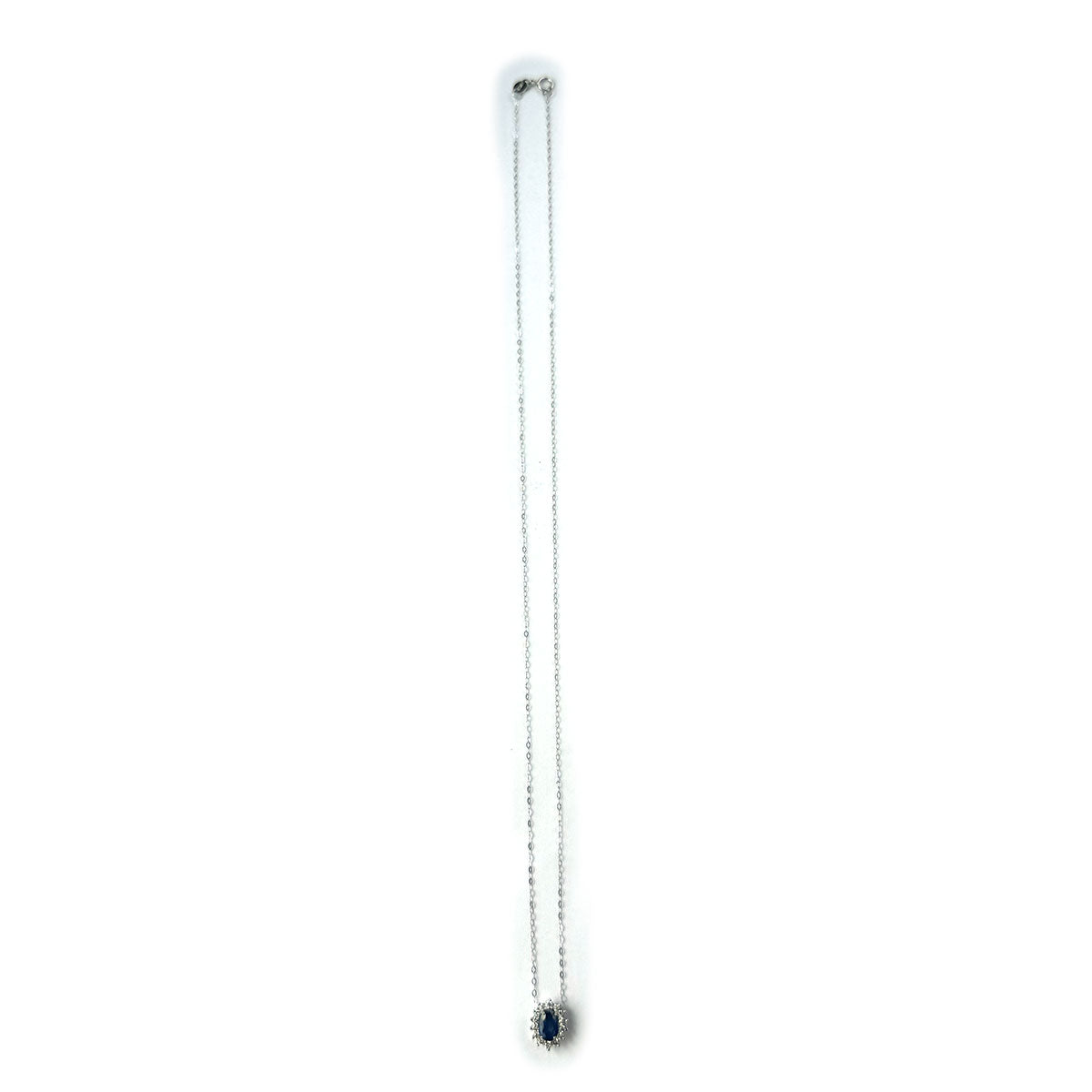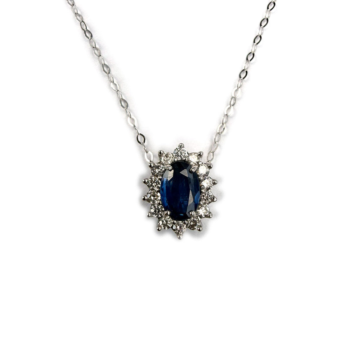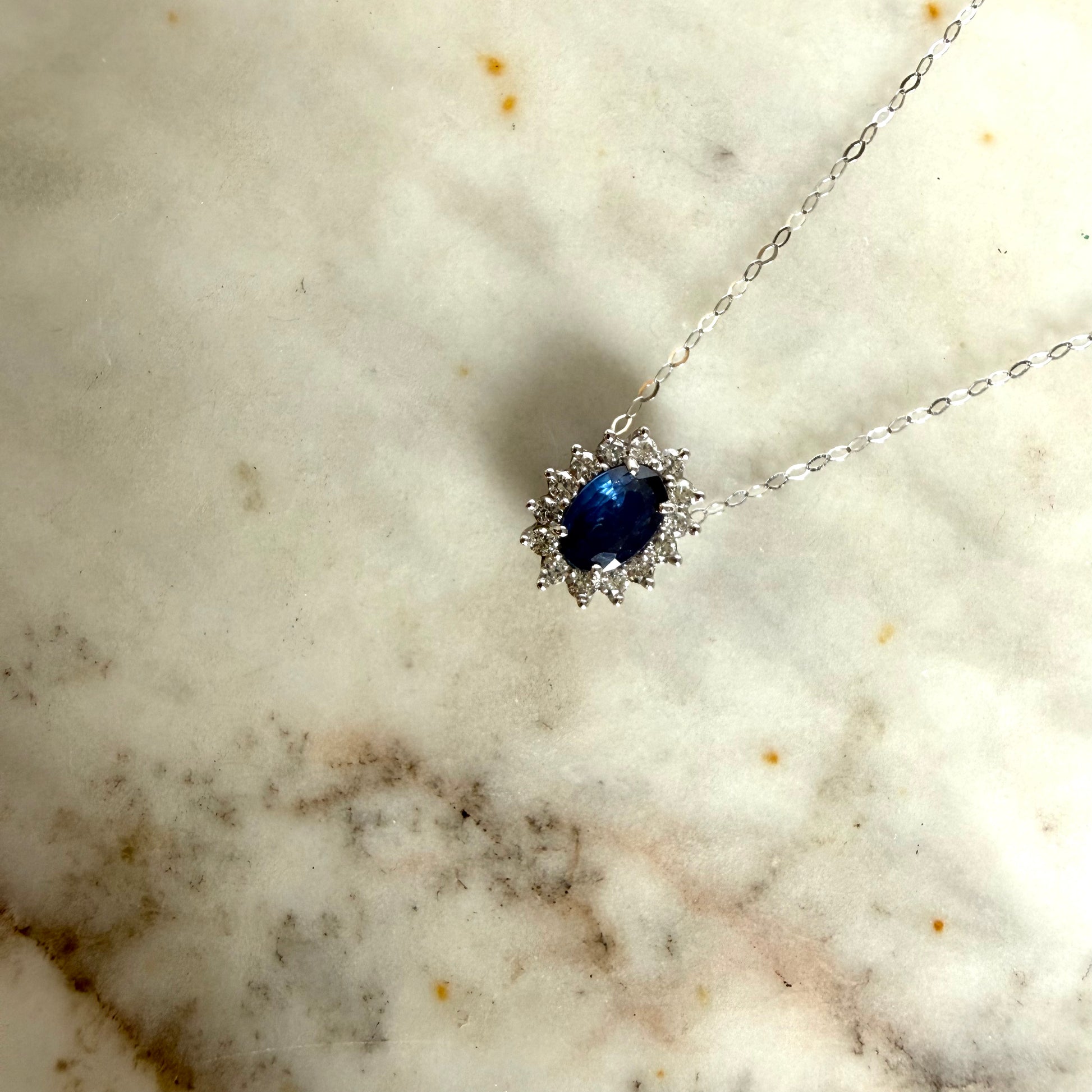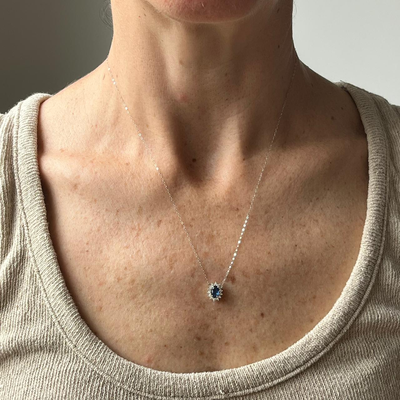 Collar en oro blanco 14K con zafiro ovalado y halo de diamantes 0.20ctw