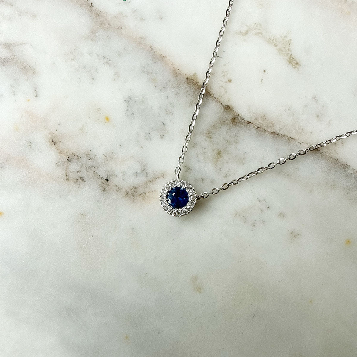 Collar en oro blanco 14k con zafiro redondo 0.13ct y halo de diamantes 0.04ctw