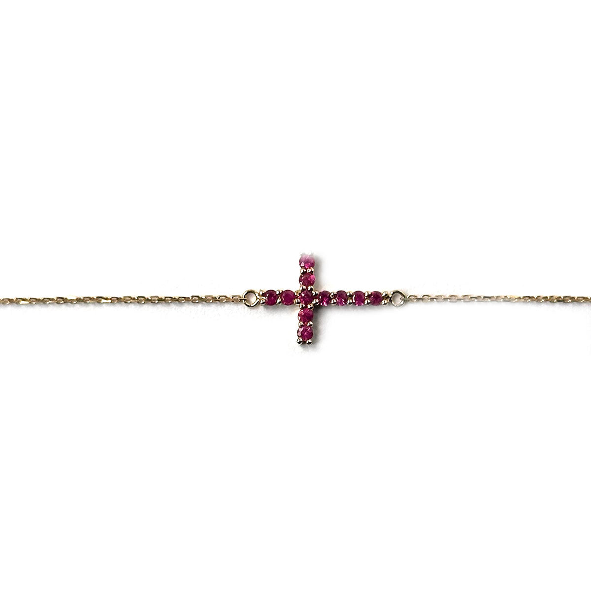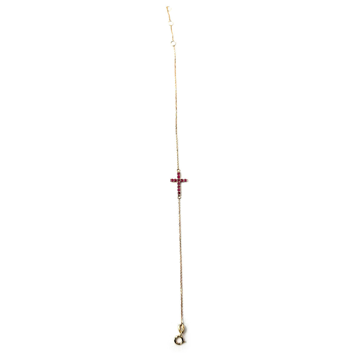 Pulsera de cadenita de oro amarillo 14K con cruz de rubíes