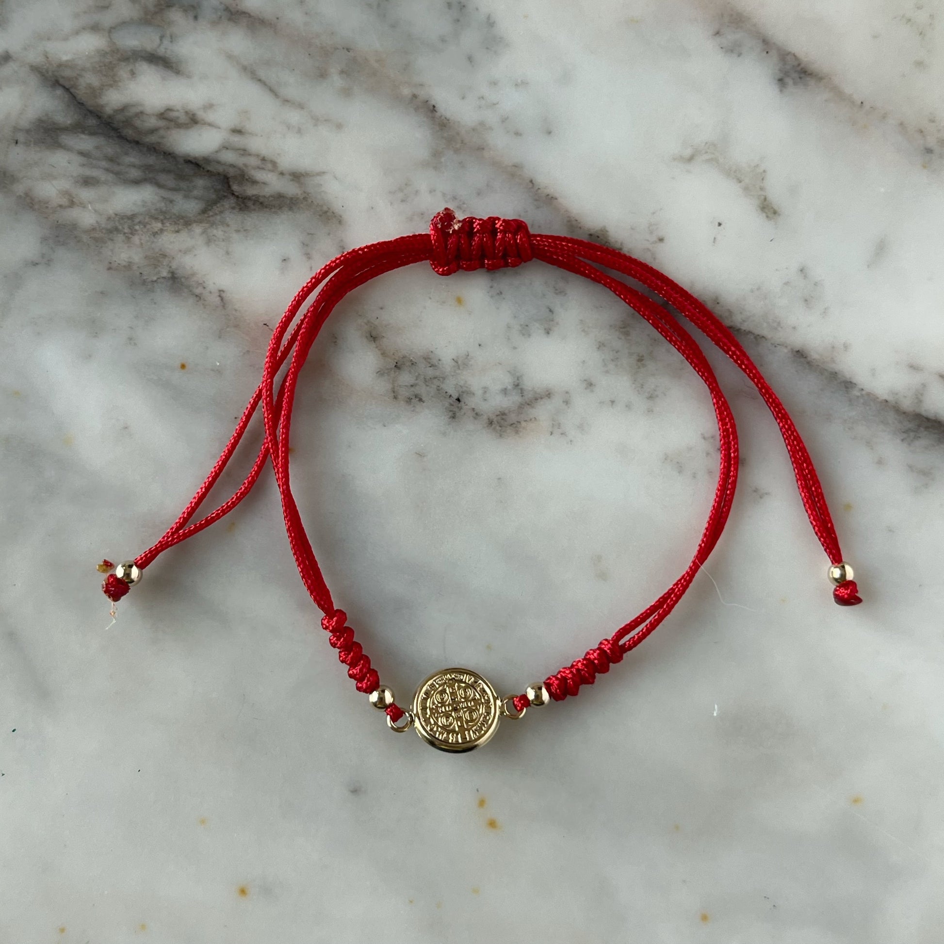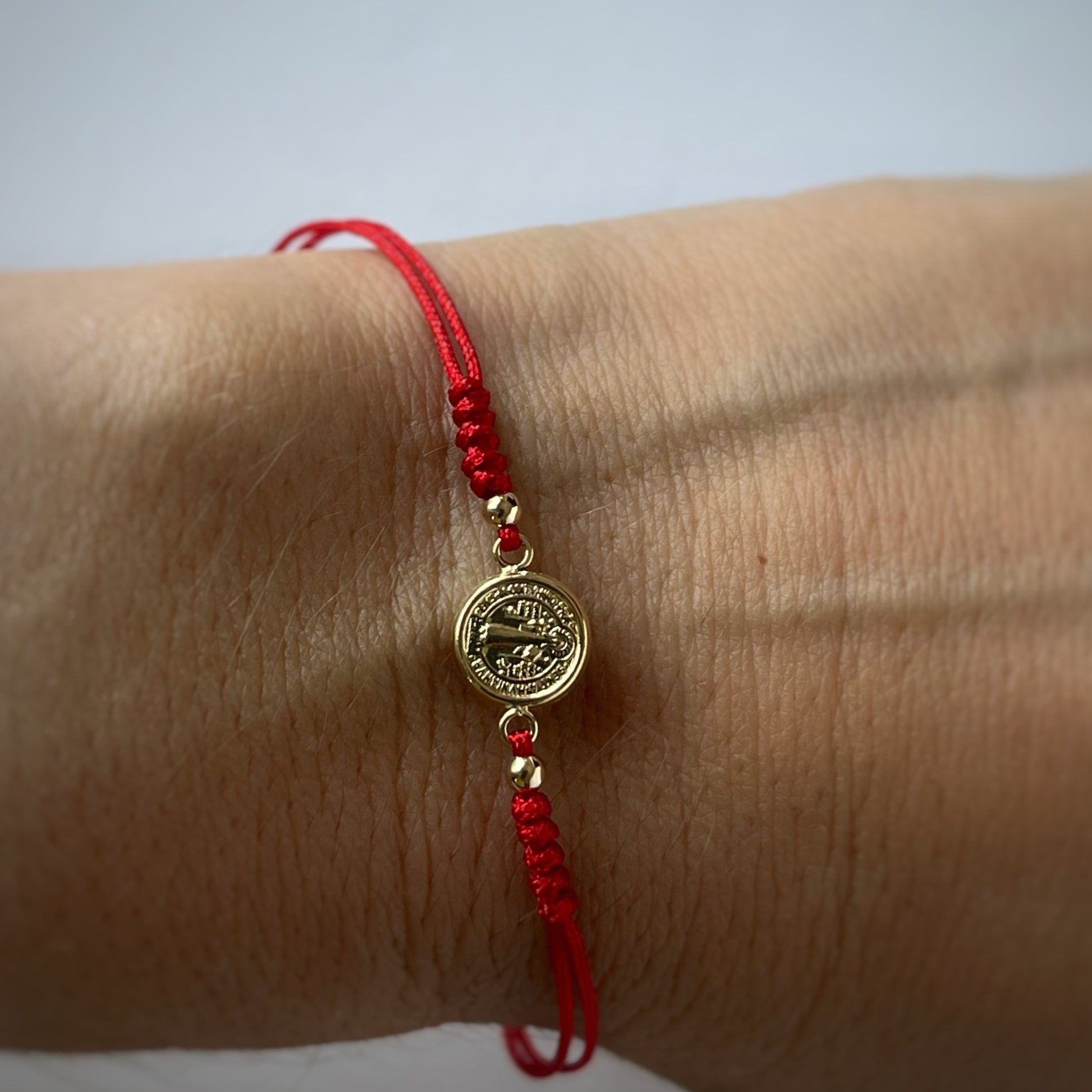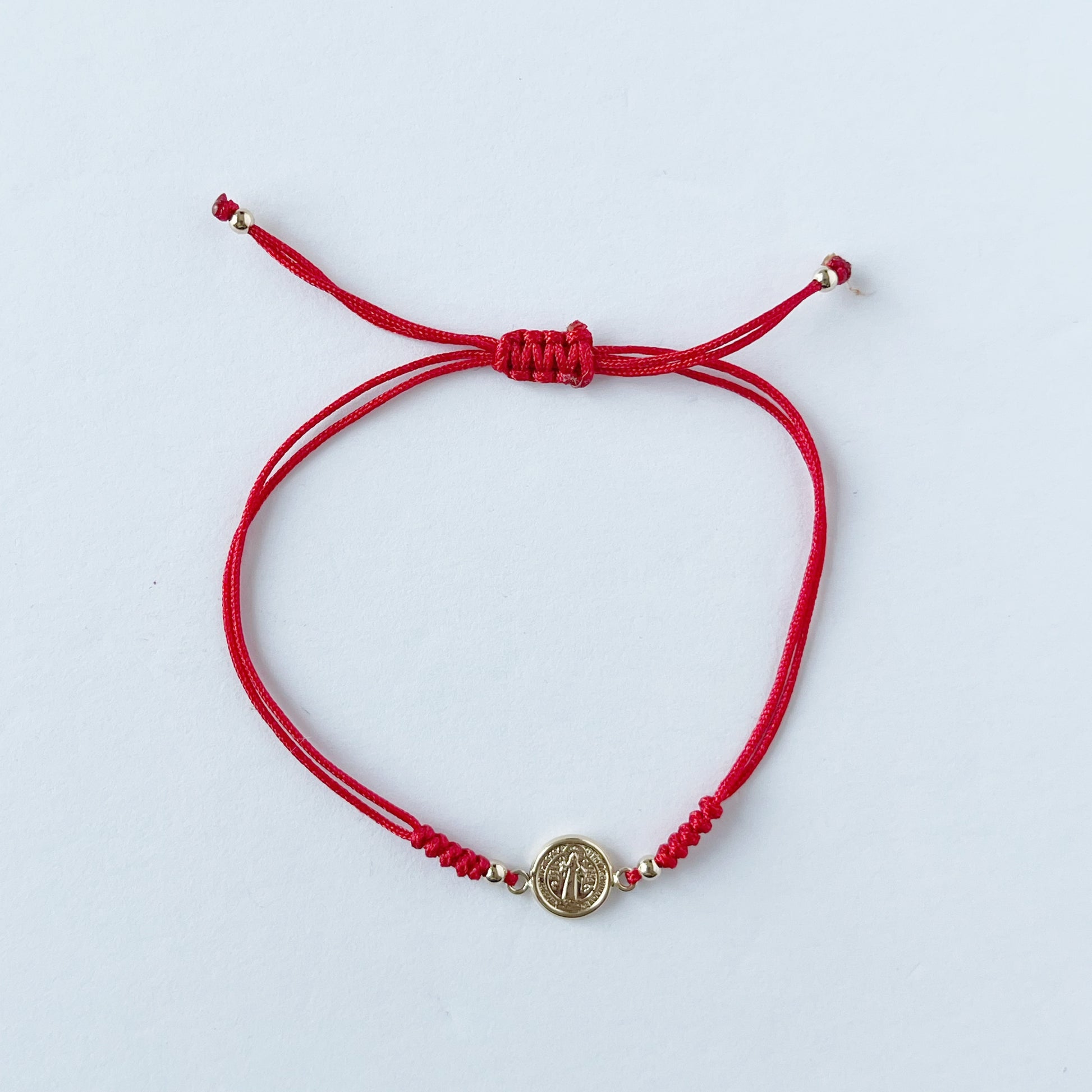 Pulsera de San benito en oro amarillo de 14K con cordón rojo